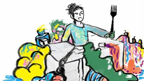 Solo – enfin presque- : sur scène, l’actrice joue avec des objets, des objets pour tous les rôles : le Père, la Mère, la Libido, le Malaise, la Tendresse…